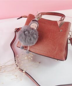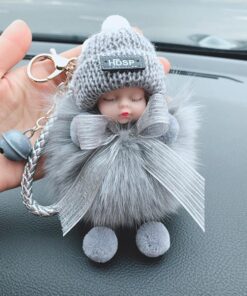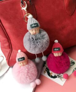 - Materijal: umjetno imitacija krzna lisice/zeca, osušeni cvijet nebeske zvijezde, metalni privjesak za ključeve, slatka silikonska beba + vunena kapa