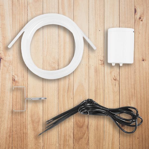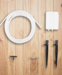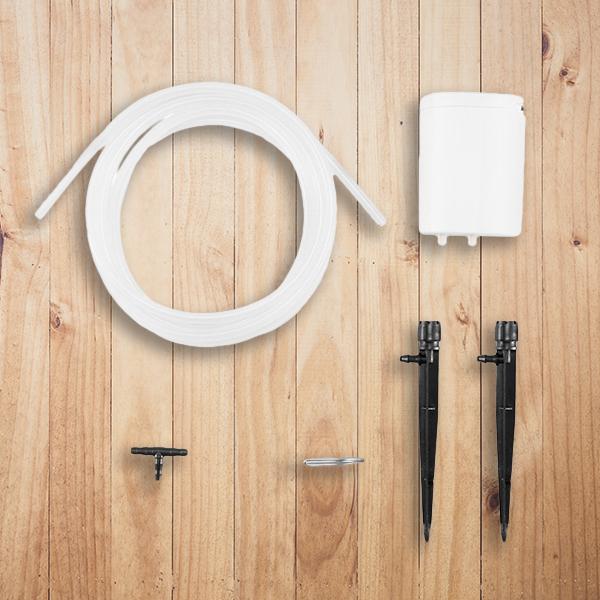 Paket uključuje: 1 set pametnog sustava za navodnjavanje IntelGarden uključuje 1 stroj za zalijevanje, 1 glavu s 5 smjerova, 1 crijevo od 3 m, 1 metalnu kuku, 1 crijevo za vodu
